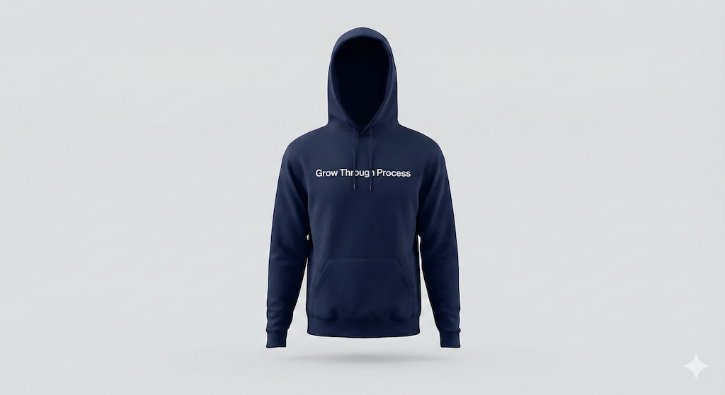 Hoodie dengan pesan “Grow Through Process” sebagai pengingat pentingnya konsistensi dalam perjalanan belajar. Desain clean dan nyaman untuk aktivitas harian.
